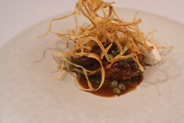 仕上げにごぼうのフリットを添え、土の香りと食感をプラスしています。